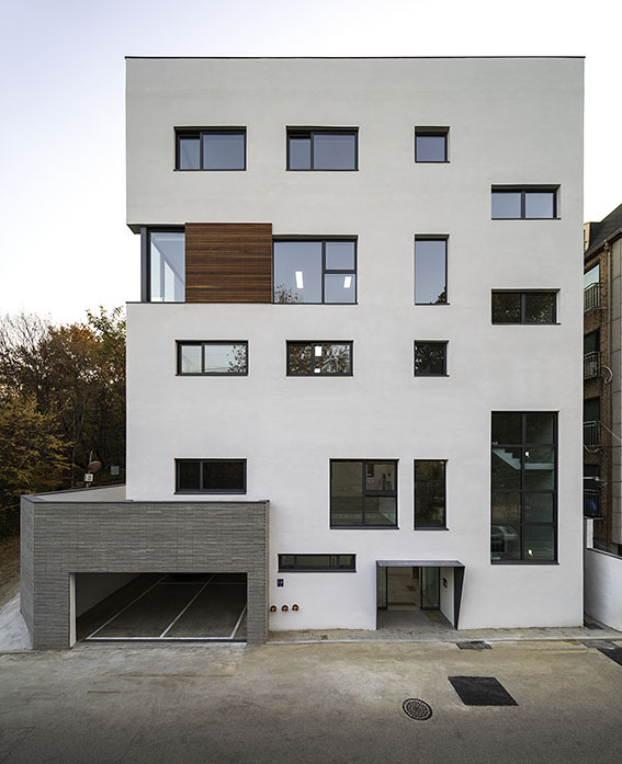 The site of the “Mokdong Yushin Medical Building” is within sight of Yongwang Moustain and a neighborhood Park, and it is composed trangles with three sides facing the road. To the east we can see the Han River and Bukhan Mountain, and we planned a building for a medical device manufacturing company on land with a shallow mountain in the south. An important part of the building’s function is to provide a warehouse that safely stores sterile medical devices. An effective number of floors was planned by using the height difference between the front and back roads of 3 meters. It was planned to have a main entrance from the front road to the basement level. In addition, the warehouse will be installed in the secocnd basement, making full use of the land area. The main office is located on the first floor, and the second floor is also equipped with a small factory that manufactures medical devices and warehouses important products. The third floor is an area for an entrepreneurial start-up, and the room for representative is located on the fourth floor.