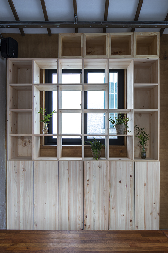 The interior space, which was divided into small rooms, consists of a single space, reinforcing the walls with wooden pillars and beams. The existing boiler and floor heating are maintained to minimize the scope of demolition. Wood windows installed on exterior walls are replaced with aluminum windows of the same size, and exterior walls consisting of red bricks and water-based paints are maintained. Steel stairs to the roof also maintain existing structures and reinforce the railings.