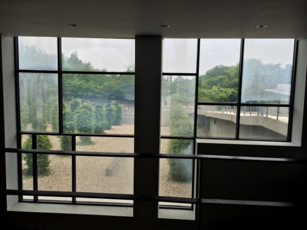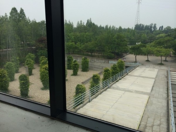 방문자안내소 앞마당의 개구부 너머 지하주차장 윗부분에 설치된 형강을 건너 공원이 보인다.