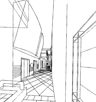 도곡동 우성 캐릭터빌 주택 부분의 안쪽 복도 투시도. 보통 아파트와 달리 넓고 천장이 높은 편복도 안쪽으로 복층형 2층 발코니가 튀어나와 있다. 오른쪽으로는 큰 창을 터서 날씨 변화를 느끼게 했다. 복도가 오로지 내 집을 가기 위한 통로가 아니라, 마치 2층 주택가의 골목길처럼 풍부해진다.